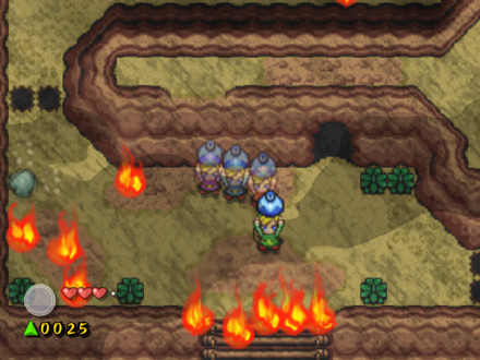 The situation is however much more dire, as much of the mountainous terrain is blocked by swaths of flames created by Shadow Link. They can be extinguished with jars of water found in caves.[3]