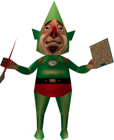 - ↑ "Answer me this... Pick one of the three choices... What color of trunks does Tingle the mapmaker wear?: Yellow, He doesn't wear any, Red" — Keaton (Majora's Mask)