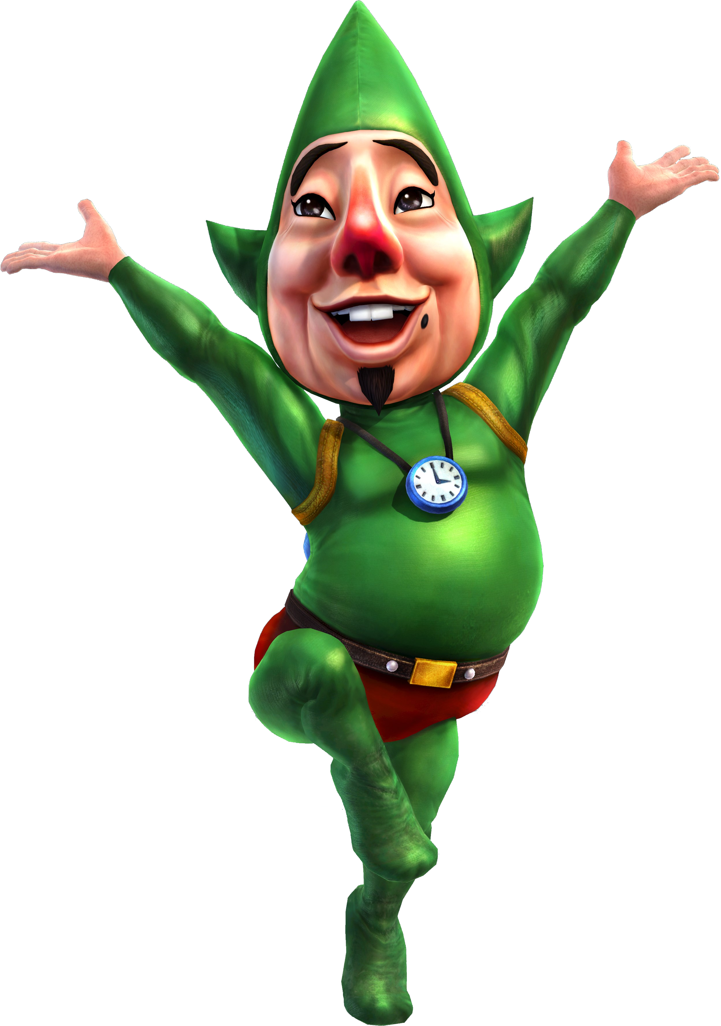Tingle is a recurring character in The Legend of Zelda series.[3][4] He is known for his flamboyant behavior, his catchphrase "Kooloo-Limpah", and outfit: red briefs worn over a green full-body jumpsuit with a pointy head and ears. He is often seen floating in the air, attached to a red balloon.