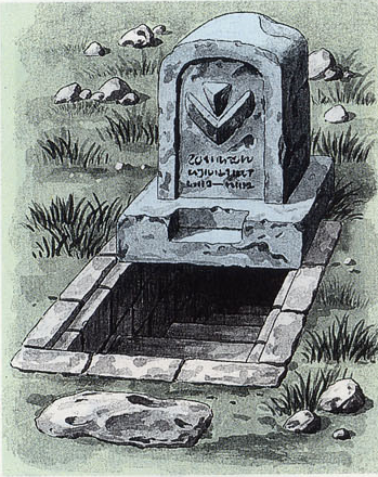 Twelve Tombstones are scattered throughout the northern portion of the Royal Valley. The top-left Tombstone can be pushed aside to reveal a cave with a Piece of Heart. The top-right Tombstone will move aside after Link Fuses Kinstone Pieces with Dampé, revealing a cave with Gina inside. Finally, the top-center Tombstone will move aside when Link uses the Flashing Spots on the Floor (initially covered by Rocks) to simultaneously press down three Floor Switches; this grants him access to the Royal Crypt.