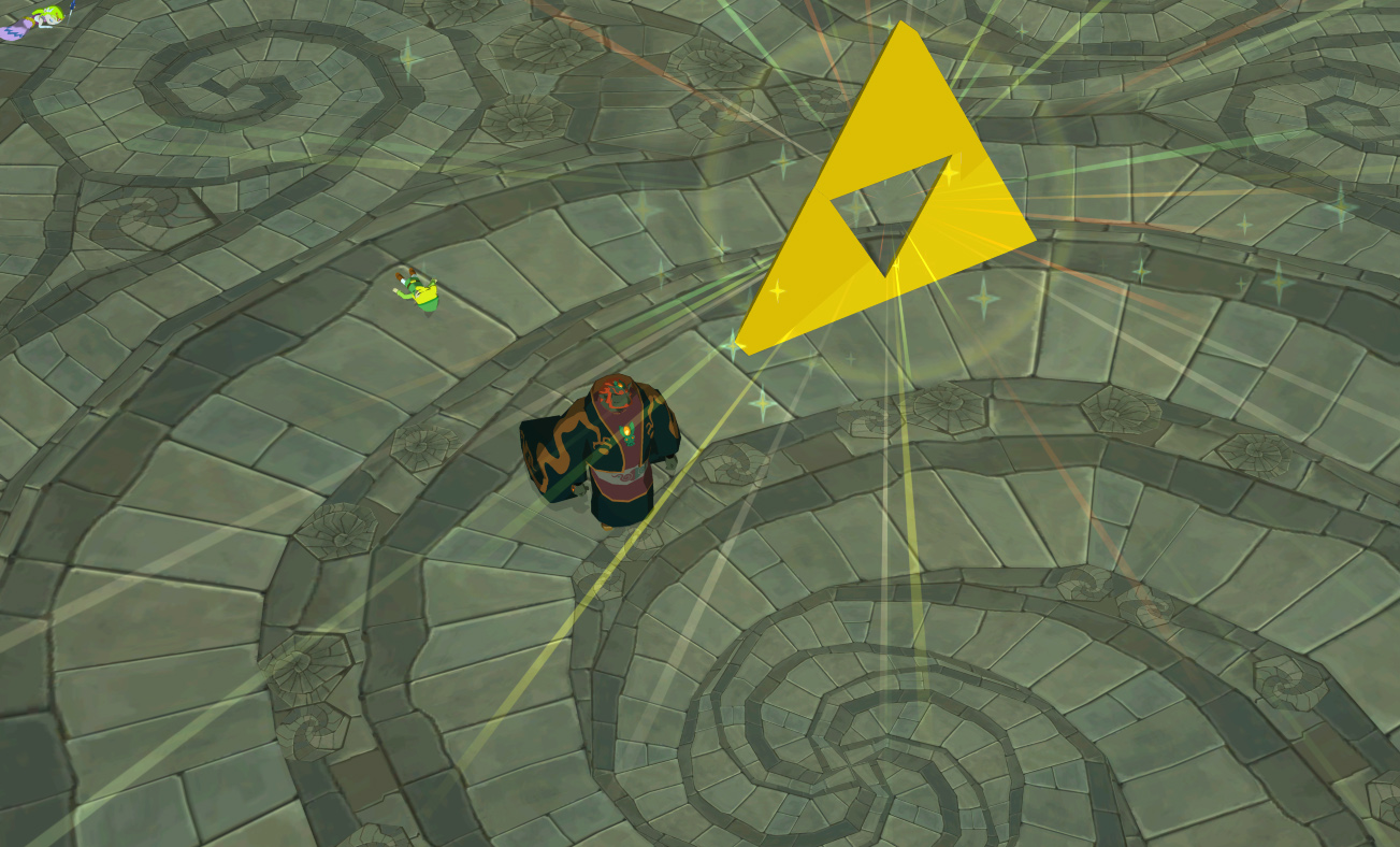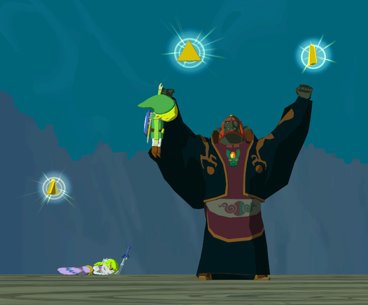 Zelda, Link and possibly Ganondorf are not turned to spirits by the Twilight just as Midna, once she receives Zelda's Triforce, does not have to transform into a shadow in the Light World, signifying that their Triforce pieces protect them.[54] It is worth noting that when Link thrusts the Master Sword into Ganon's chest at the end of the game, Ganon's Triforce of Power stops glowing on his hand.
