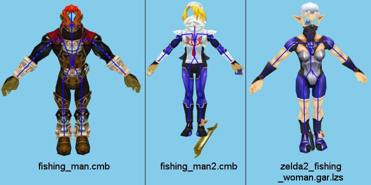 - Unused models of Sheik, Impa, and Ganondorf can be found in the game's files. Their file names make reference to a fisher man, suggesting that they may have been planned to appear inside the Fishing Holes.