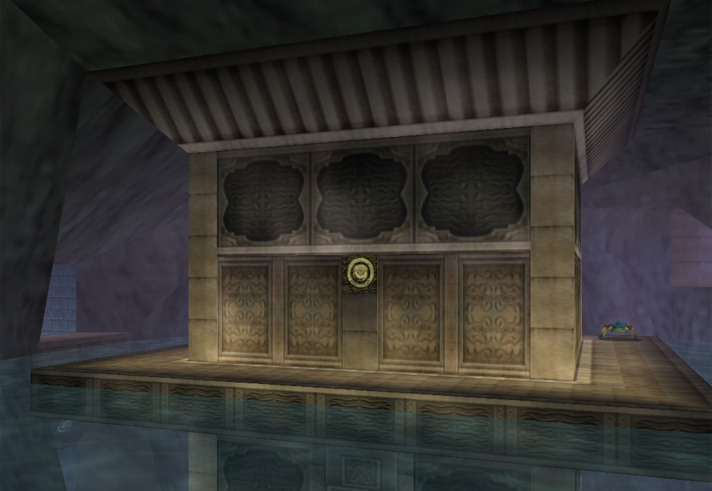 The ancient temple lies deep under the vast Lake Hylia. Guarded by the Zoras, it is considered a sacred temple that is used to worship the water spirits.[1] The Water Temple is accessible after the young hero finds the Iron Boots in Ice Cavern. Aided with the boots and the Hookshot, Link can access its entrance by shooting the target above the gate.