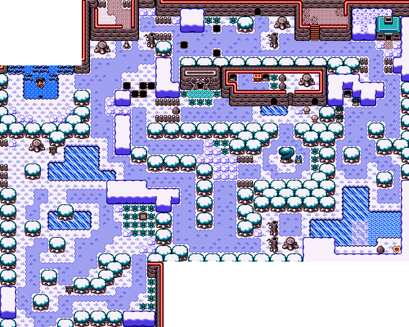 Given the numerous trees that block off paths in the area, the Woods of Winter is most easily navigated in winter (hence its name), when the leaves have fallen off the trees and the ponds have frozen over. However, to reach the Snake's Remains, Link must clear the snow blocking the path using the Shovel acquired from Holly, who lives in a House in the northeastern corner of the woods. Since the door of her House is barred, Link must enter it from the chimney that can be reached by climbing the adjacent snowbank in winter. After tumbling into the House through the chimney, causing a startled Holly to mistake Link for Santa, she orders Link to clear her walkway, giving him the Shovel and allowing him to keep it afterwards.[3] With it, the young hero can shovel his way to the heart of the woods, where the Snake's Remains is located. Nearby is Holodrum's Mystery Tree, from which Link obtains his first Mystery Seeds. In autumn, the Golden Moblin appears near Snake's Remains.