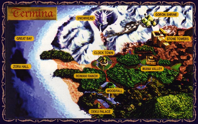 - ↑ "Initially, the entire map will be covered in clouds, but as you purchase maps of areas, the clouds covering these areas will lift, revealing that area on the world map." (Majora's Mask manual, pg. 36)